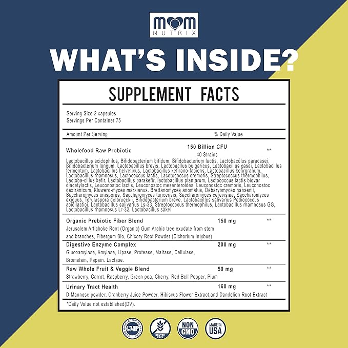 - ✅ 150 BILLION CFU, 40 STRAIN – Here comes the ultimate probiotics for adults with natural prebiotics & essential digestive enzymes. MOM NUTRIX probiotic contains 150 billion CFU per serving with 40 strain probiotic for women and men to maintain overall wellbeing.