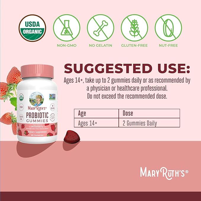- For Most Lifestyles: MaryRuth's Organic Probiotic Gummies for Adults are USDA Organic, Non-GMO, Vegan, Pectin Based, No Gelatin, No Artificial Colors, Made in a GMP Facility. Dairy Free, Nut Free, Gluten Free, Soy Free, Made With Organic Cane Sugar. B Corp Certified. Clean Label Project Certified.