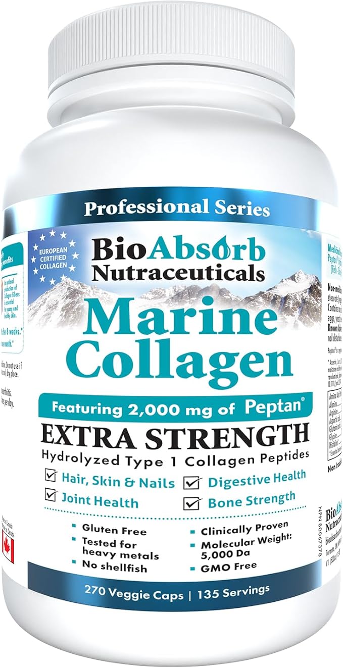 Bio Absorb Marine Collagen Capsules, Mercury Free, No Fish Aftertaste, 67-Day Supply of Hydrolyzed Marine Collagen Powder, Type 1 Marine Collagen Peptides (270 Pills of Fish Collagen Powder)