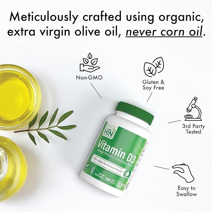 Health Thru Nutrition Vitamin D3 1,000iu 360 Mini Softgels for Maximum Benefit | 25mcg Cholecalciferol | 3rd Party Tested | Non-GMO USP Grade in Organic EVOO | Immune Health Support