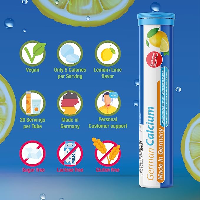 T&D German Calcium 500 mg - 40 Vegan Drink Effervescent Tablets - Lemon Lime Flavor - Made in Germany