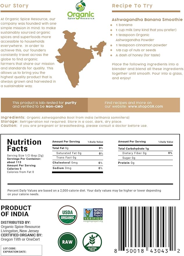 - PREMIUM USDA ORGANIC ASHWAGANDHA POWDER (WITHANIA SOMNIFERA or INDIAN GINSENG) - Our Gluten Free Organic Ashwagandha Root Powder is packed in a resealable kraft bag to maintain freshness! Our Product is certified by Non-GMO Project Verified