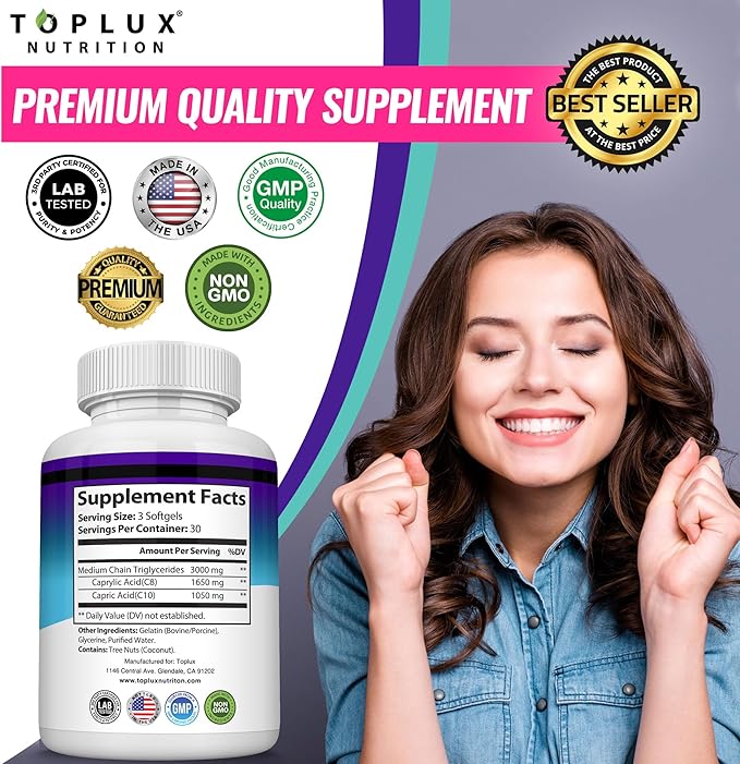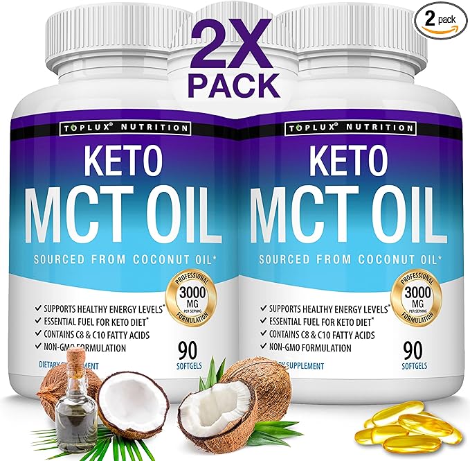 - Convenient Softgel Form - Enjoy the benefits of MCT Oil in a tasteless softgel form. With 90 softgels per bottle, Toplux Keto MCT offers enough supply to start your Keto MCT journey, making it simple to add into your daily regimen. No messy oils or complex measurements — just straightforward, easy to take supplement. Enhance your nutrition with the benefits of MCT oil c8 and c10 from coconut oil