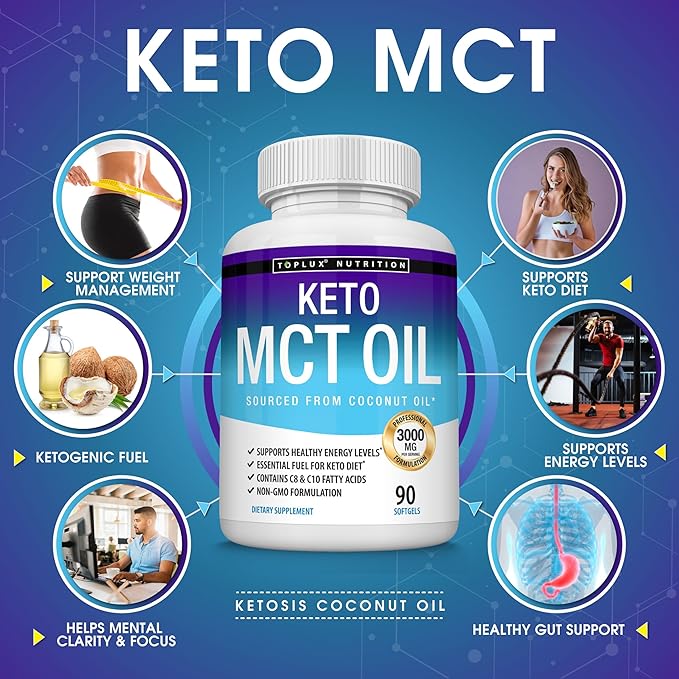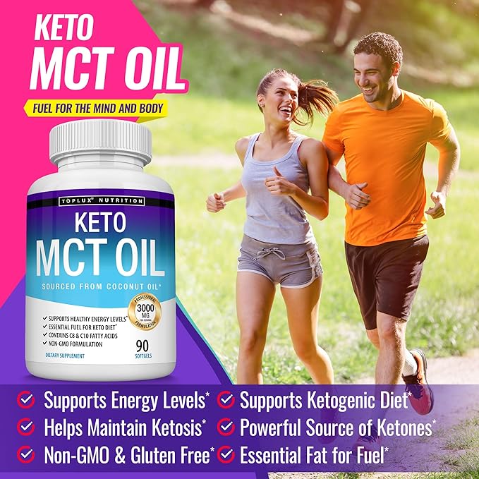 - Supports Natural Energy - Toplux Keto MCT is designed to help you stay energized throughout your day. MCT Oil Softgels are greartsource of energy, made of finest coconut oil. They are easily absorbed and converted into energy, making them an excellent addition to your keto lifestyle. Whether you're at work, at the gym, or on the go, Toplux Keto MCT helps keep you powered up.