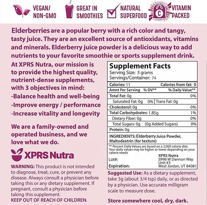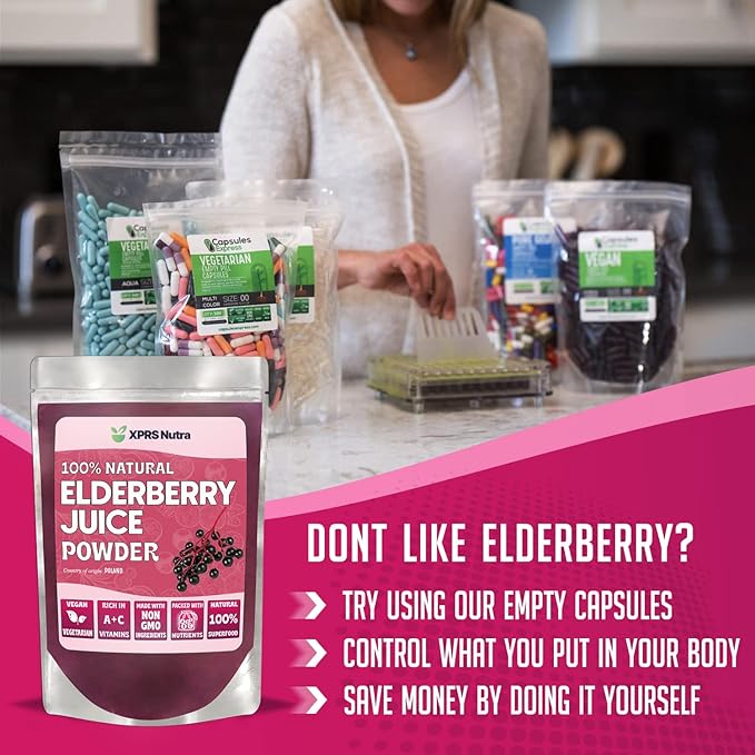 - Love Your Supplements: You'll love the superior quality of our elderberry juice powder. Here at XPRS Nutra, our first priority is ensuring that we are providing our customers with premium elderberry powder bulk in an ethical manner, at an affordable price. Don't like the taste of elderberry? Try filling it in our empty capsules.