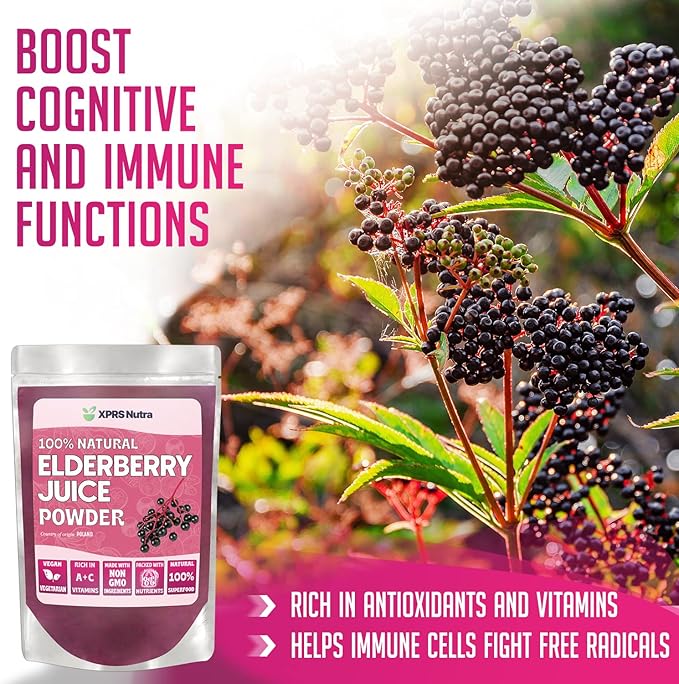 - Ideal for Juices: Try out our elderberry drink mix as a shake and smoothie booster, or incorporate it into your favorite recipes. This immune booster is one of the most nutritious superfoods out there. Our powdered elderberry juice absorbs quickly into your body and elderberry juice pure organic easily digestible. Try taking elderberry for colds as well.