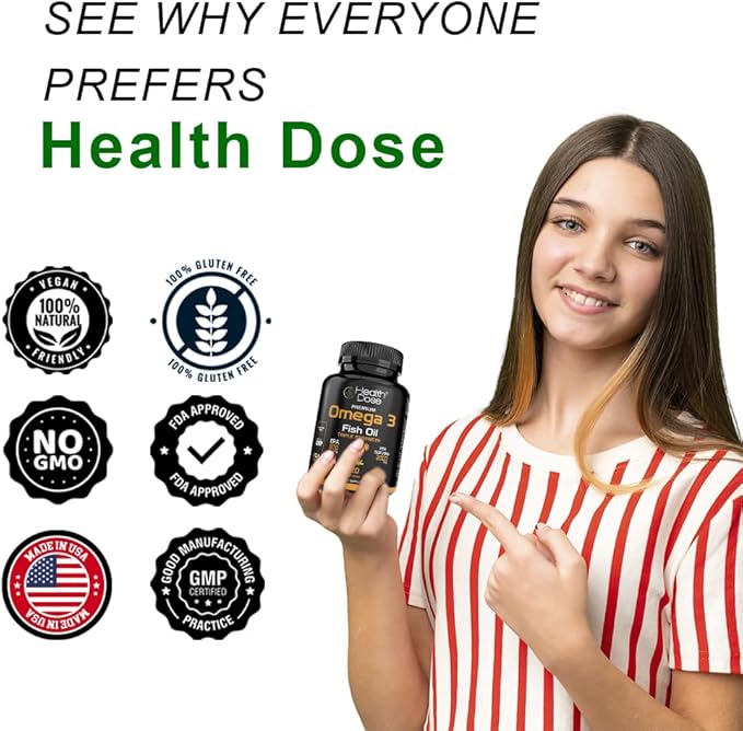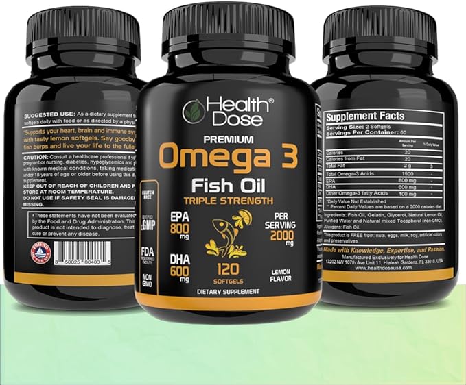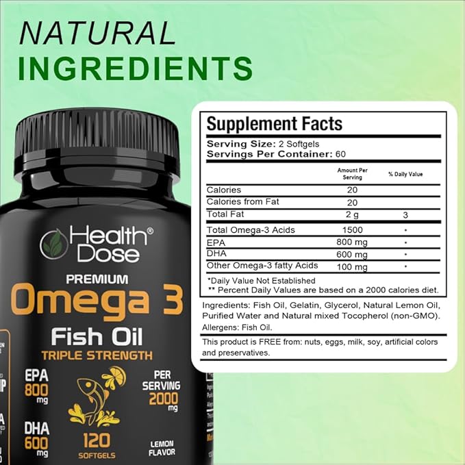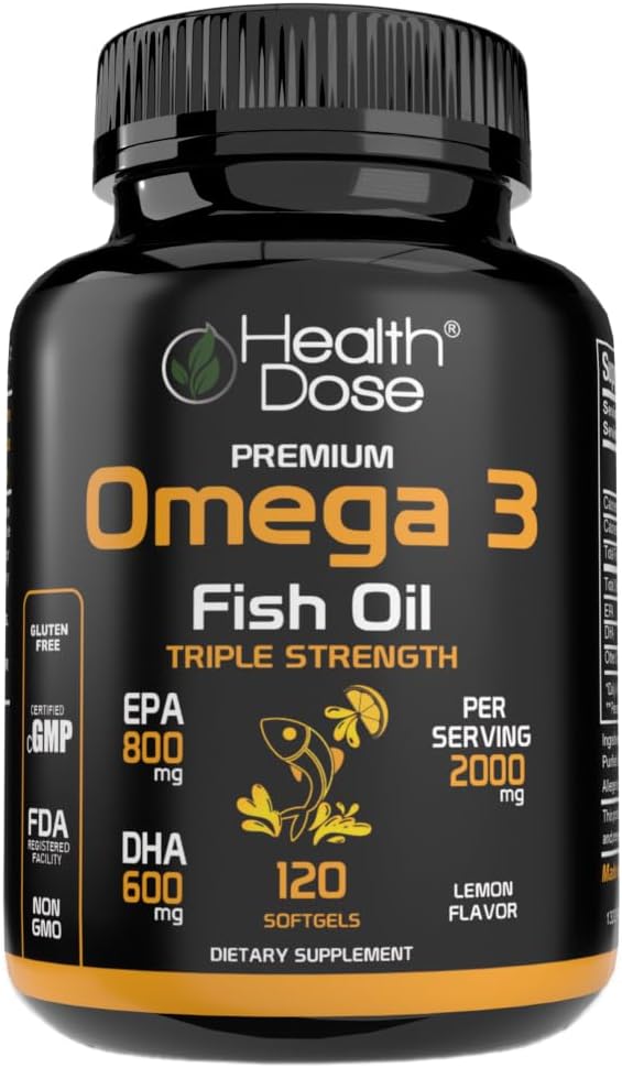 - Health Dose Supply -- 120 Softgels | 2 months supply, 1 more month than most brands | For Women & Men | 800mg EPA | 600mg DHA | In total 2,000mg Fish Oil per serving | Gluten Free, Non-GMO, Lemon Flavor.