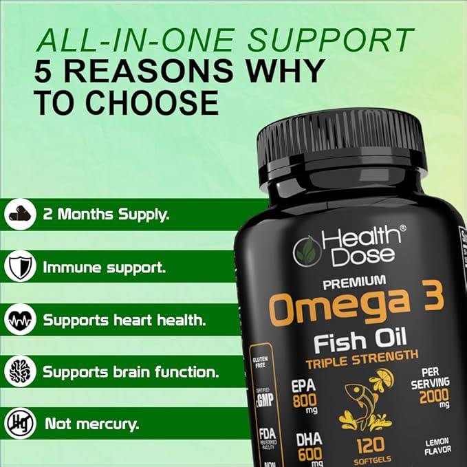 - Product Benefits : Enhanced Absorption with No Fish Burps – Our lemon-flavored softgels are specially formulated to maximize absorption while reducing the common issue of fish burps, ensuring a pleasant and effective experience every time you take them., Supports Overall Wellness – Packed with EPA and DHA, essential Omega-3 fatty acids, this supplement is formulated to promote your brain, heart, and immune system health, helping you maintain well-being and vitality., Committed to Purity and Quality – Every bottle of our Omega-3 fish oil is produced with strict quality control, ensuring purity and consistency in every softgel, so you can trust the product you're using., Easy-to-Digest, Gentle on Your Stomach – These softgels are created to be easily digestible, reducing the chances of experiencing indigestion or discomfort, which makes them suitable for those with sensitive stomachs., Two-Month Supply for Greater Value – With 120 softgels per bottle, you get a full two-month supply, offering more value and fewer reorders compared to most other Omega-3 supplements., Ultra-Strength Formula for Maximum Effectiveness – Formulated with a high-potency dose of Omega-3s, our softgels provide a powerful support for your overall health, contributing to everyday wellness. Enhanced Absorption with No Fish Burps – Our lemon-flavored softgels are specially formulated to maximize absorption while reducing the common issue of fish burps,… See more