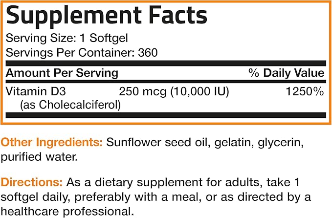 - Healthy Immune Support: Vitamin D3 10,000 IU softgels help to support a healthy immune system, strong bones, muscles, teeth, and more.* Our once daily D3 softgels are easy to swallow and help to replicate the benefits of the natural sunshine without sun exposure.