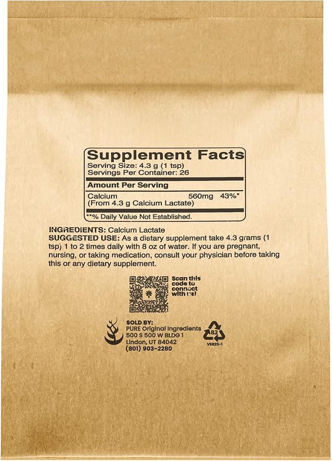 - Pure Original Ingredients Calcium Lactate Powder is made from a single ingredient, providing a pure undiluted supplement