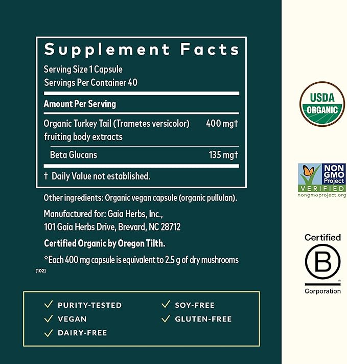 - Purity-Tested: Gaia's Turkey Tail Mushroom is vegan, organic, gluten-free & proudly made in NC, USA