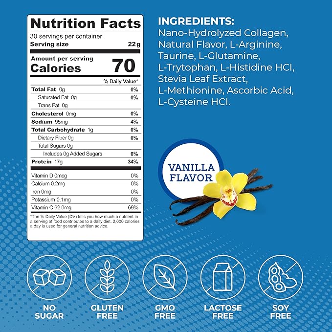 Collagen Protein Powder, 17g Protein Nano-Hydrolyzed Grass Fed Collagen, Vitamin C, 2g Arginine for Wound Support, Gluten Free, All Natural, Fat and Sugar Free, 0g Carbs, Vanilla, 23 oz, 30