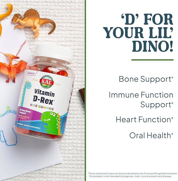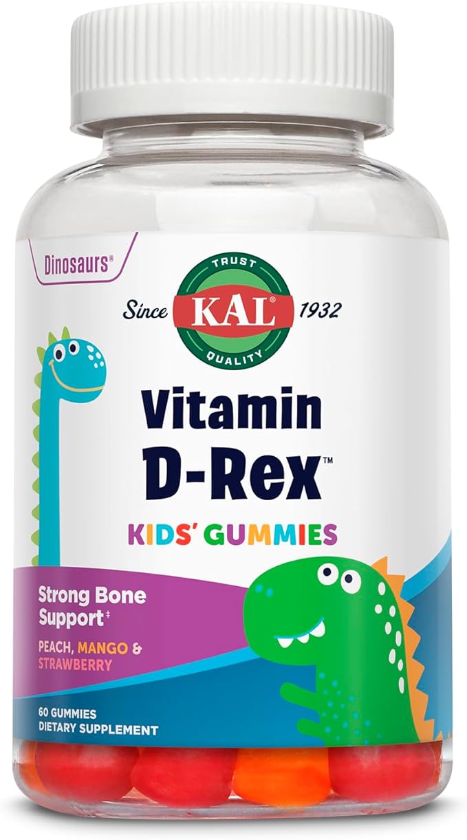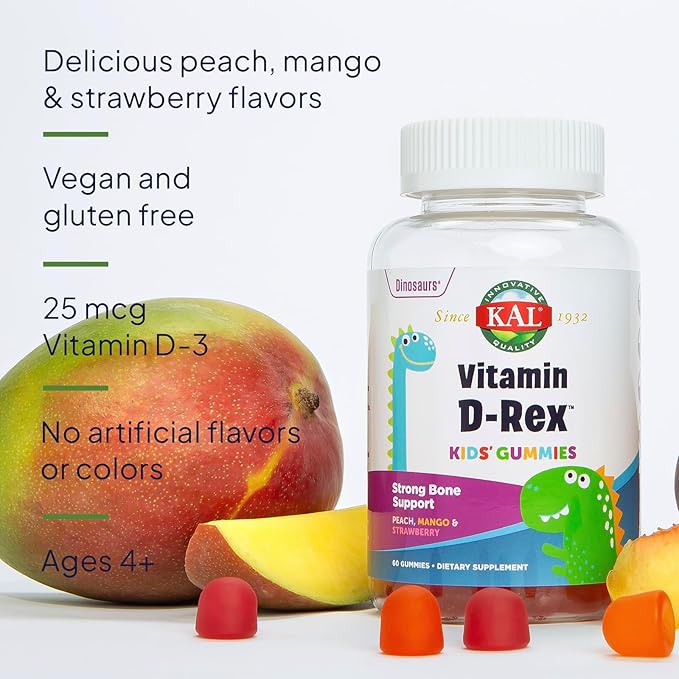 KAL Vitamin D-Rex - Vitamin D Gummies for Kids - Kids Vitamin D3 - Peach, Mango, and Strawberry Flavors - Immune, Heart, Bone & Oral Support - Vegetarian, Gluten Free - 60 Servings, 60 Gummies