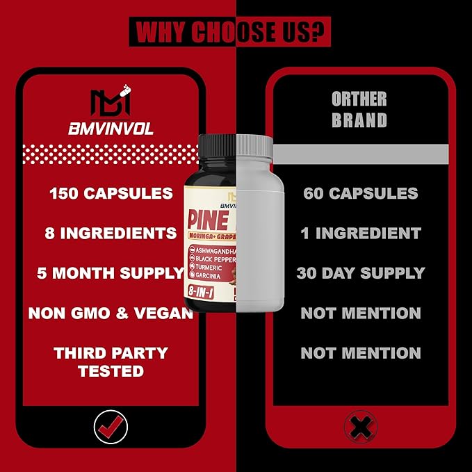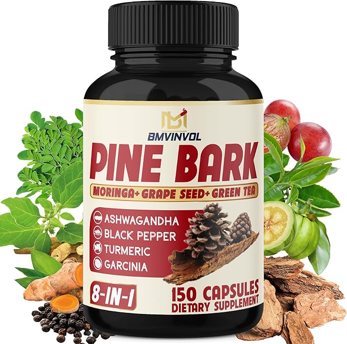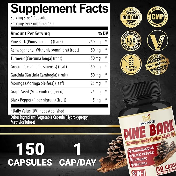 - Our Pine Bark supplement contains 8 premium ingredients per capsule, including Pine Bark, Ashwagandha, Turmeric, Green Tea, Garcinia Cambogia, Moringa, Grape Seed, and Black Pepper.