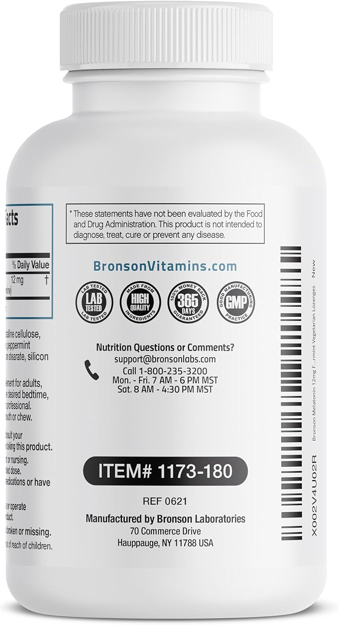 - High-Potency Formula: Providing a potent 12 MG per vegetarian lozenge of high-quality Melatonin to help support a healthy night of sleep.* Bronson’s great tasting peppermint formula provides fast support and can be taken at any time.