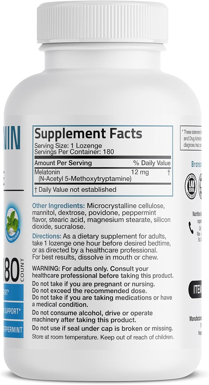 - Fall Asleep Faster: Melatonin is a hormone naturally produced in our bodies that supports healthy sleep cycles, but its balance can easily be disrupted. Bronson’s Melatonin 12 MG Peppermint Lozenges act quickly and help promote a healthy night of rest.*
