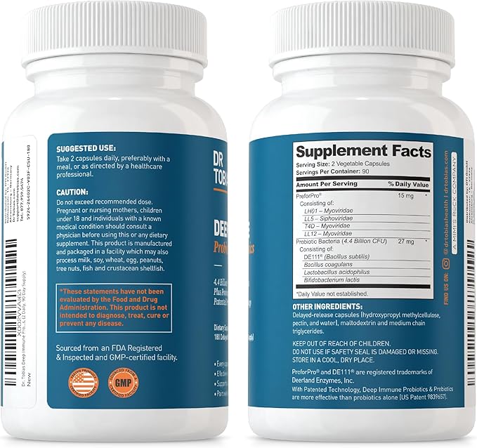 Dr. Tobias Deep Immune Probiotics & Prebiotics, Dual Action Digestion & Immune Support with PreforPro Prebiotics & Delayed Release Spore Forming Probiotics for Women & Men, 180 Capsules, 90 Servings