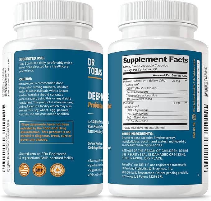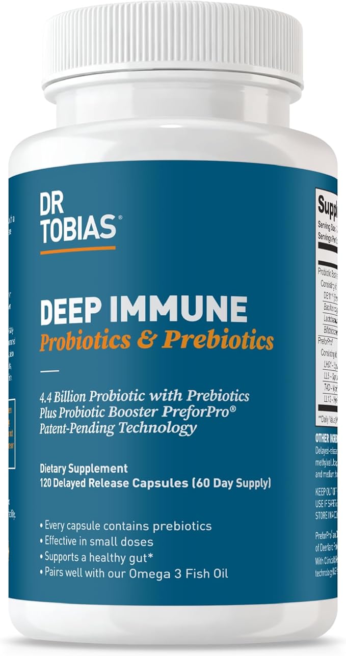 Dr. Tobias Deep Immune Probiotics & Prebiotics, Dual Action Digestion & Immune Support with PreforPro Prebiotics & Delayed Release Spore Forming Probiotics for Women & Men, 120 Capsules, 60 Servings