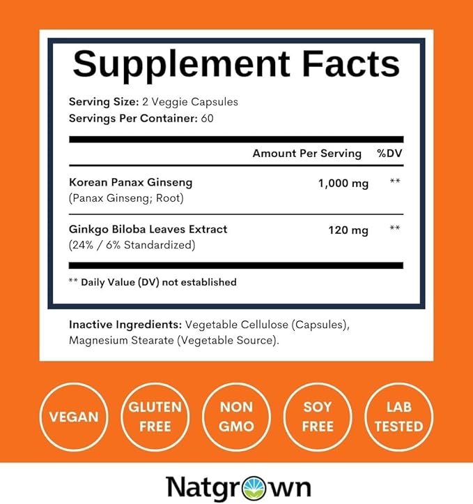 Natgrown Panax Ginseng & Ginkgo Biloba Supplement - Red Korean Ginseng & Ginko Biloba Capsules for Men & Women - Supports Memory Focus & Brain Function - Vegan Pills - 120 Count