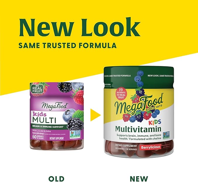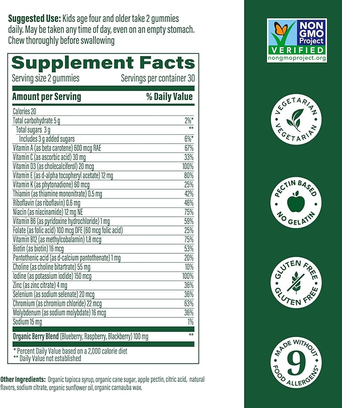 MegaFood Kids Multivitamin Gummies - Kids Vitamins - Age 4+ with Vitamin C, Vitamin D, Zinc, Choline, and Real Fruit - Brain & Immune Support - Berrylicious Flavor - 60 Gummies (30 Servings)