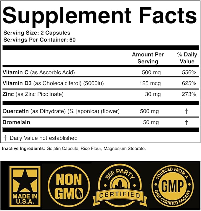 Zinc Quercetin 500mg with Vitamin C Vitamin D3 Bromelain Immune Support High Potency Quercetin Zinc Supplement ZQV by SPARTIS (Pack of 1 Bottle at 120-Caps)