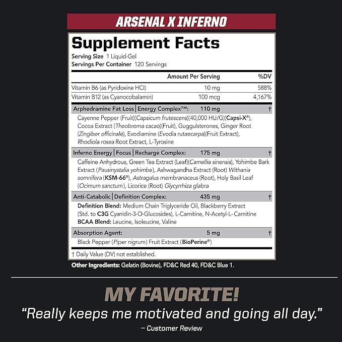 - Strong Fat Loss: Arsenal X INFERNO features an energizing, sports performance-driven blend of advanced agents in its Arphedramine Fat Loss|Energy Complex. This innovative blend Features Capsi-X to support a strong thermogenic effect. This unique complex is coupled with six additional compounds to further support energy levels, satiety, and calorie burning for extreme results.