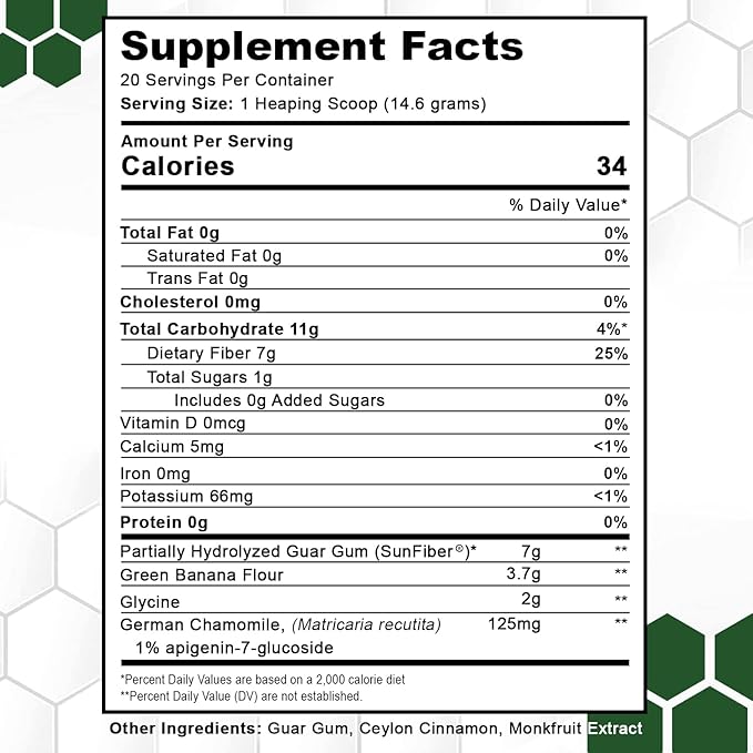 - 7g Dietary Fiber Drink Mix w/ German Chamomile: The SleepBiotic Prebiotic Fiber supplement features a natural gut health powder blend of ingredients including Sunfiber Prebiotic Fiber Blend (Partially Hydrolyzed Guar Gum), green banana flour, and glycine powder. But unlike other prebiotics & high fiber supplements, the SleepBiotic is fortified with 125mg of German Chamomile in every serving to promote relaxation & sleep