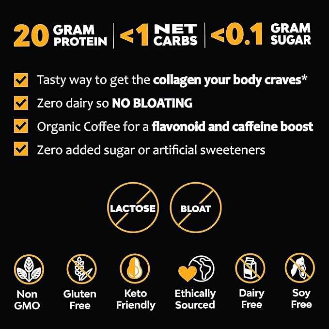 - NO ADDED CAFFEINE - naturally occurs in Organic Coffee. 20g protein, 1.5g BCAAs, 99 cal, <1 Net Carb, <0.1g sugar.