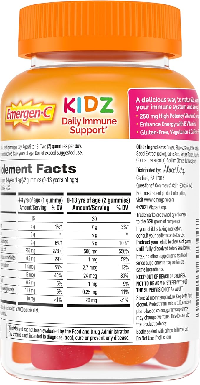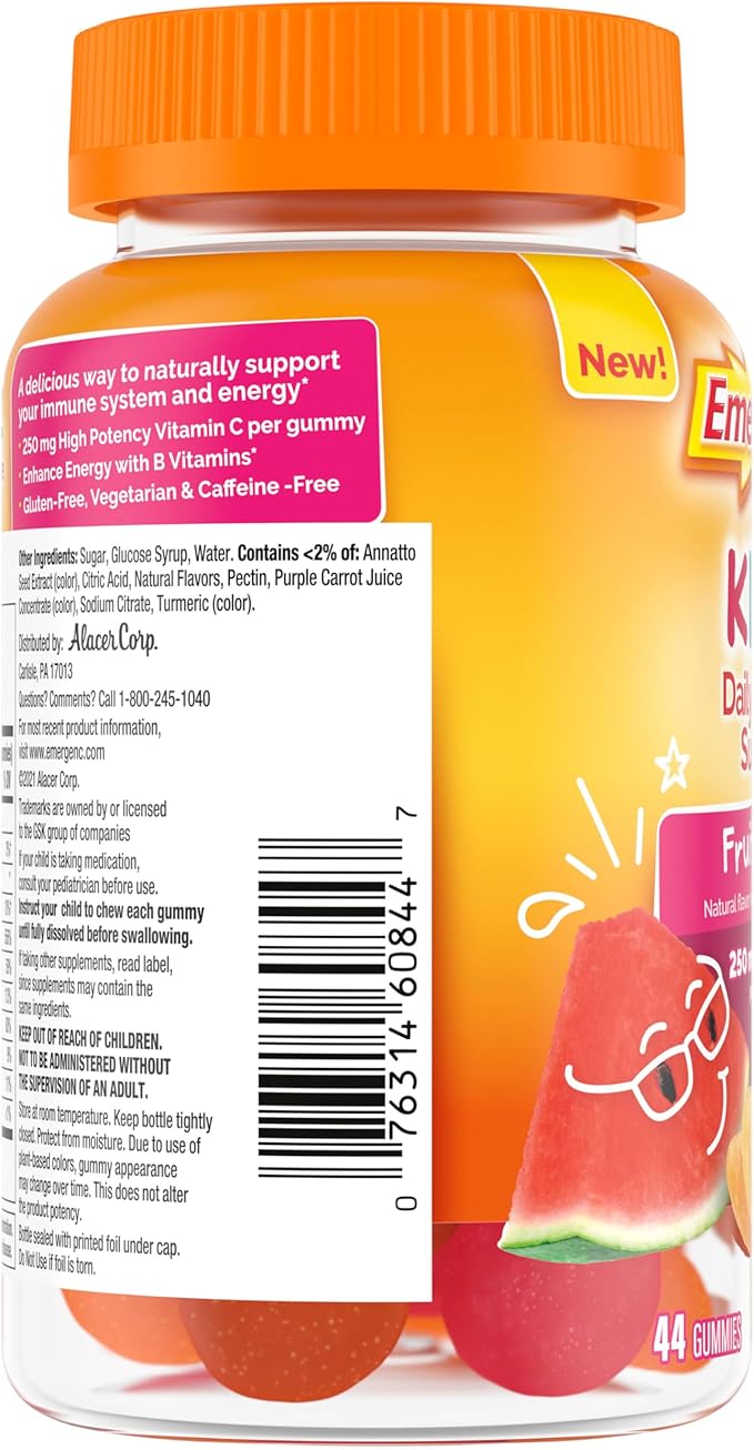 - 44 count bottle of Fruit Fiesta flavored Emergen-C Kidz Daily Immune Support (1) Dietary Supplements, Flavored Gummies with Vitamin C and B Vitamins