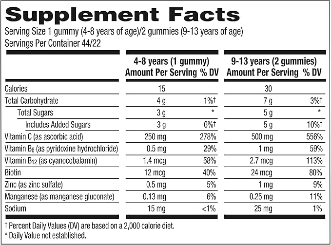 - Dietary supplements with 250 mg of high potency vitamin C for kids per gummy
