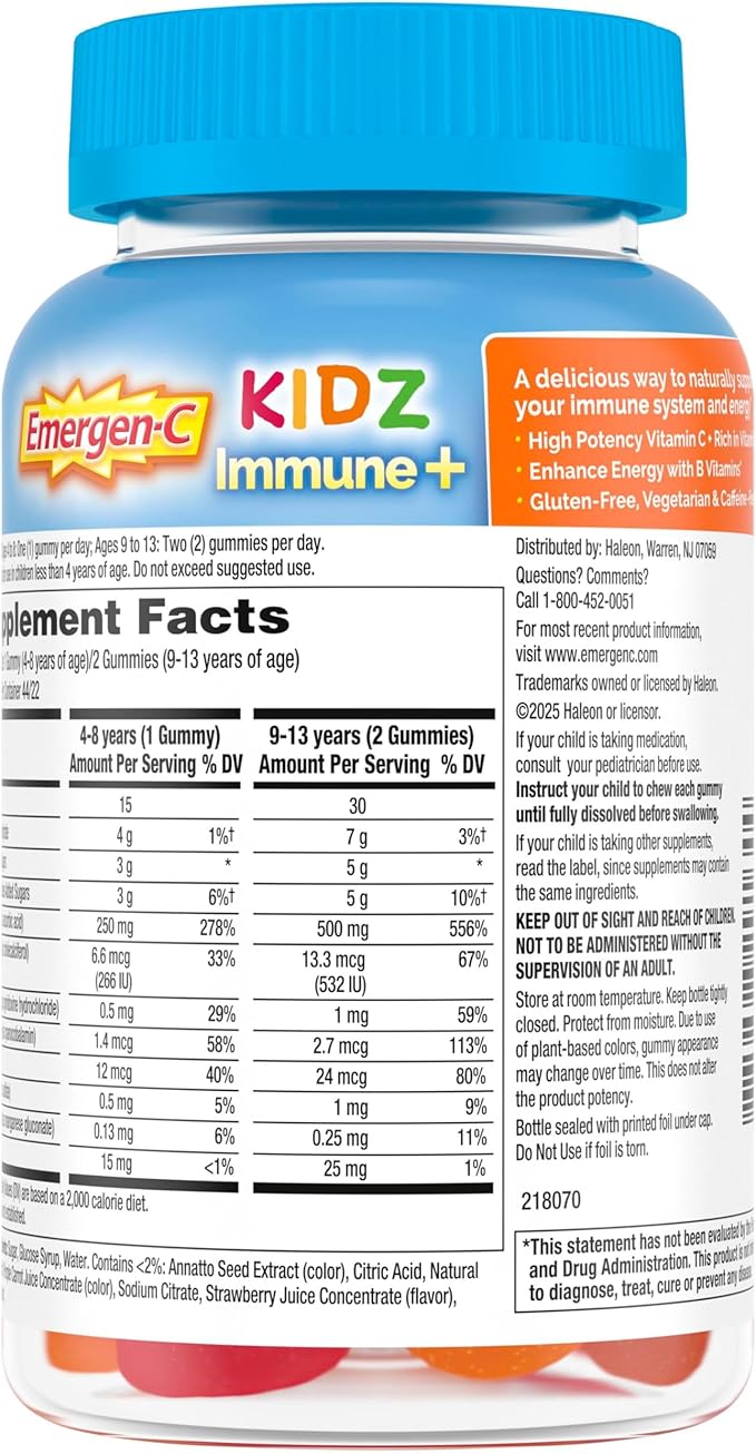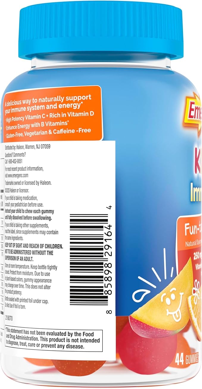 - 44 count bottle of Fun-tastic Fruit flavored Emergen-C Kidz Immune+ Immune Support (1) Dietary Supplements, Flavored Gummies with Vitamin C, B Vitamins and Vitamin D