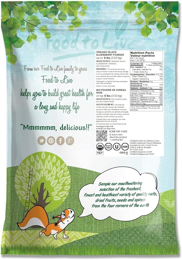 - ✔️ ORGANIC, NON-GMO, KOSHER & VEGAN: This Black Elderberry Powder by Food to Live is Organic, Non-GMO, Raw, Kosher, and Vegan. Besides, it is free of cholesterol and trans-fat.