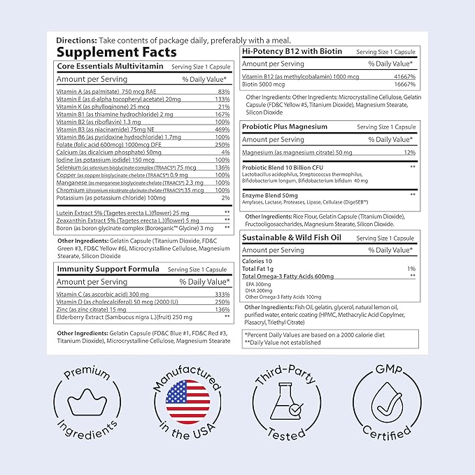 - CONVENIENT: Our vitamin packs make taking vitamins easy. More than a multivitamin for men or multivitamin for women, each daily pack includes 22 essential vitamins and minerals, plus omega 3, probiotics, digestive enzymes, elderberry, lutein and zeaxanthin. Perfect for active lifestyles.