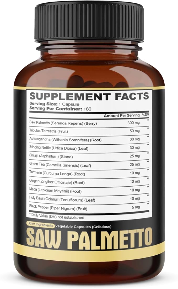 - 🌿 Potent Saw Palmetto Berry Supplements with Saw Palmetto Berries, Ashwagandha Root, Turmeric Curcumin Root, Holy Basil (Tulsi), Black Pepper, Shilajit Powder, Nettle Leaf, Ginger Powder, Green Tea, Tribulus Terrestris, Maca Root; Elevate well-being.