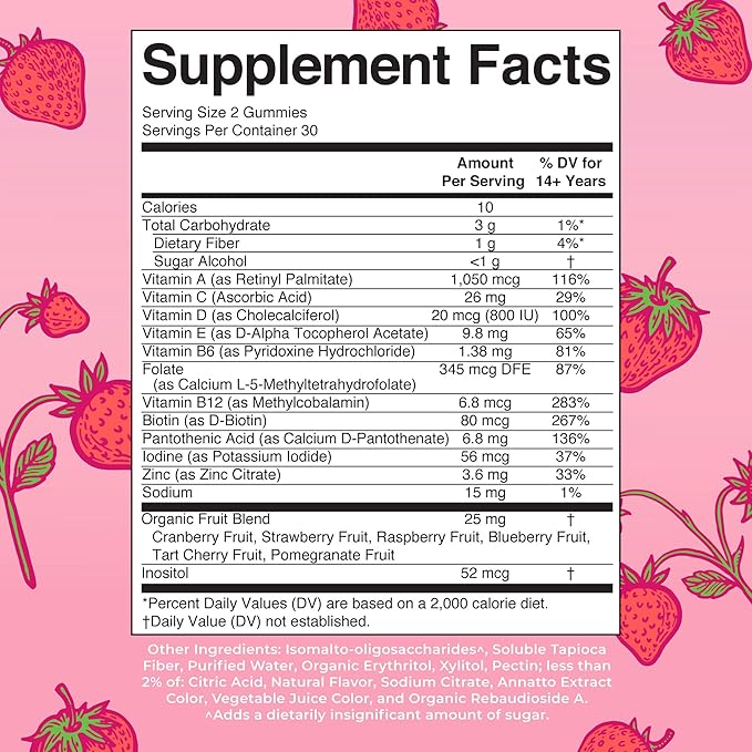 - Womens Multivitamin Gummies: Multiple key vitamins and minerals packed into delicious vegan, strawberry flavored gummies! These gummy vitamins include a blend of five B vitamins — vitamin B5, vitamin B6, biotin (B7), B9 (folate as methylfolate), and methyl B12 (as bioavailable methylcobalamin).