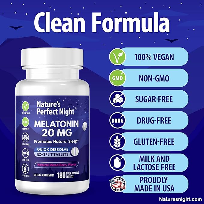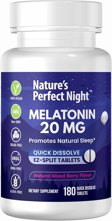 Nature's Perfect Night | Melatonin 20mg | 180 Quick Dissolve Tablets | Natural Mixed Berry Flavor |High Potency | Sugar Free | Vegan | Gluten Free | Value Size