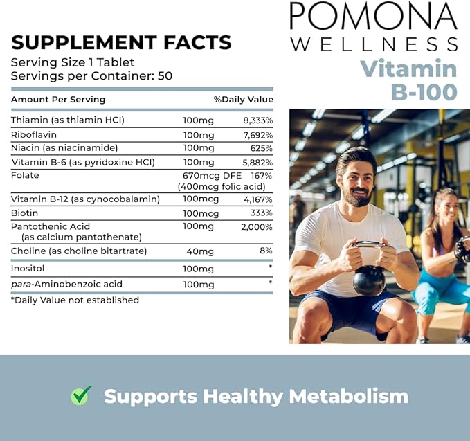 Pomona Wellness Vitamin B Complex Supplement with Folic Acid, High Potency Multivitamin, All 10 B Vitamins Including B12, Supports Energy Levels, Heart Health, Non-GMO, 50 Tablets