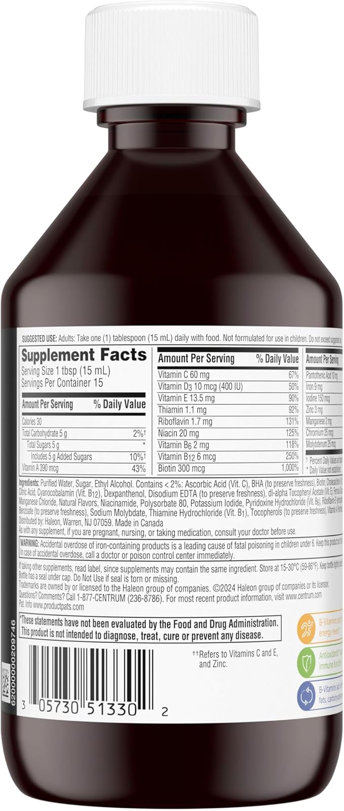 - One 8 fl oz bottle of citrus-flavored Centrum Liquid Multivitamin for Adults, Multivitamin/Multimineral Supplement with B Vitamins and Antioxidants