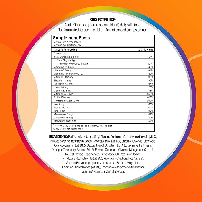 - Liquid multivitamin iron supplement with vitamins B, C, E, beta-carotene and zinc