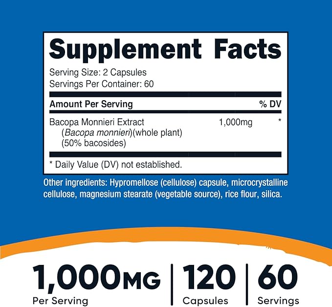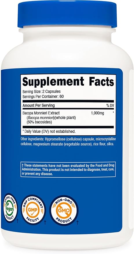 Nutricost Bacopa Monnieri 1,000mg, 120 Capsules (60 Servings) - Non-GMO, Gluten Free, and Vegetarian Friendly