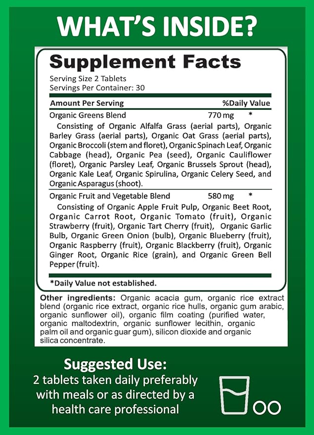 - Uncompromising Quality: Our vegetable supplements for adults are crafted with care to meet the highest standards. Made in a GMP certified facility in the USA, these organic greens and superfood tabs provide a convenient way to enjoy the benefits of a premium fruit and veggies supplement. Elevate your wellness routine with our veggie vitamins for adults add them to your cart today.
