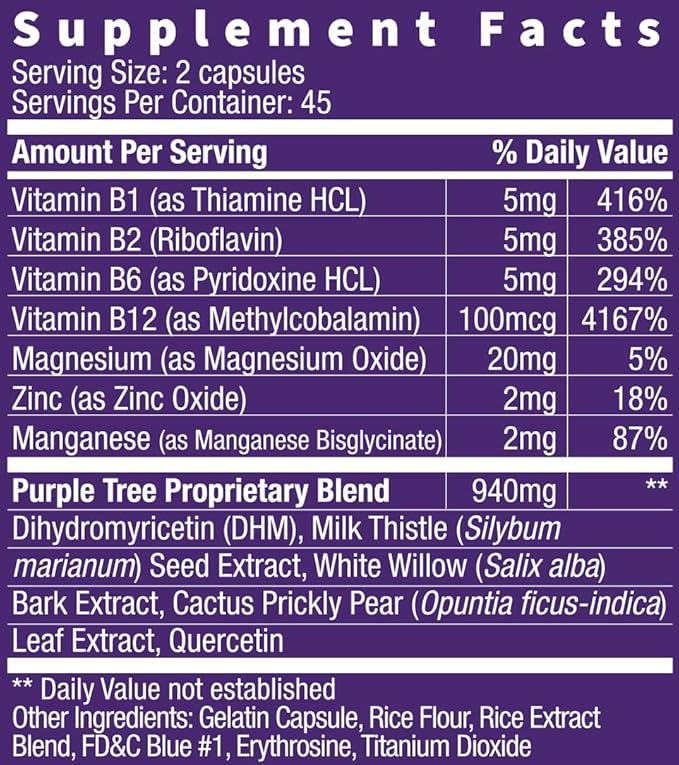 - Elevate Your Mornings: Purple Tree's lab-tested, pure ingredients and formula include Milk Thistle, Willow Bark, and Dihydromyricetin (DHM), a liver support herb.* DHM is a Japanese raisin tree (the "purple tree') natural extract that has been used since ancient medicine.