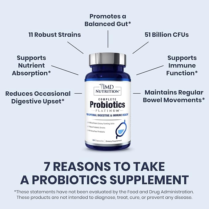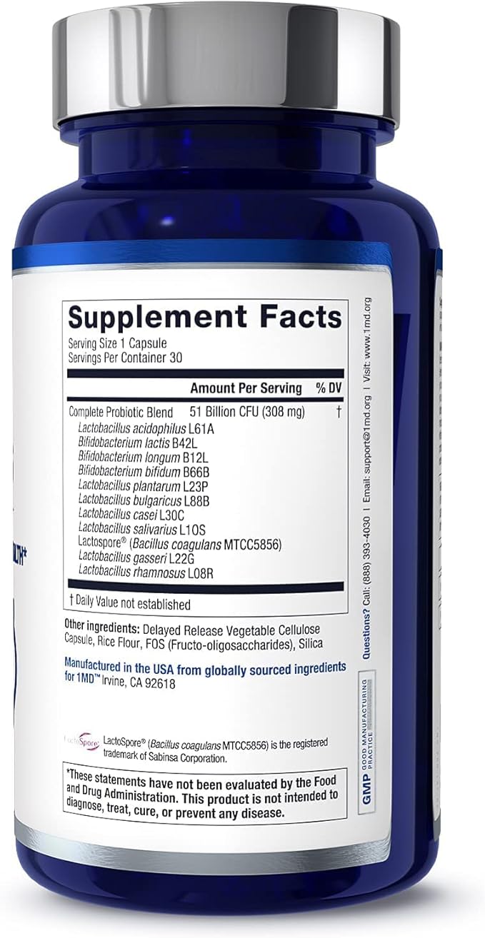 - 51 Billion Powerful CFUs Per Capsule: Live, colony-forming units of bacteria help support proper digestion and whole body health. 1MD Nutrition’s Complete Probiotics Platinum is formulated with an assured 51 billion CFUs per capsule.