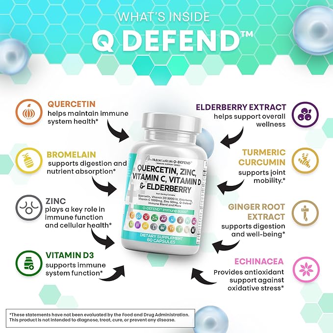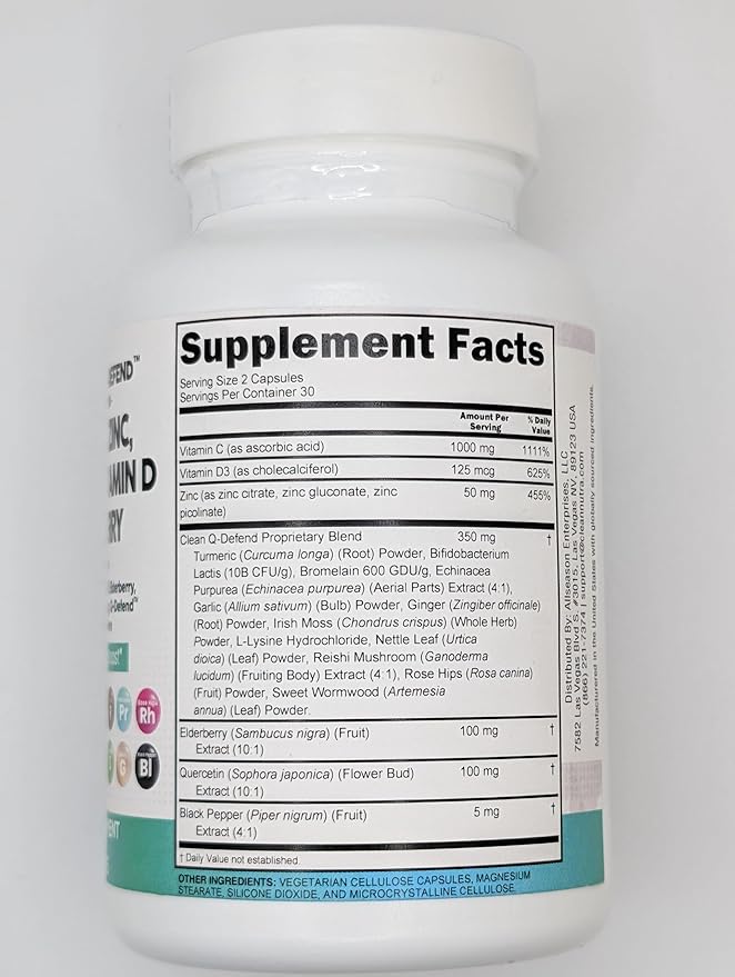 - Q-Defend Immune Blend - Don’t settle for products that only supply the basic immune supplements such as vitamin C, vit d3 and elderberry. Our signature Q-Defend immune blend contains these essential ingredients plus turmeric, echinacea, ginger root, garlic powder, nettle, reishi mushroom, rose hips, bromelain, and even irish seamoss! Our powerful formula offers 18 hand-selected ingredients that could help improve your overall health in a variety of ways!
