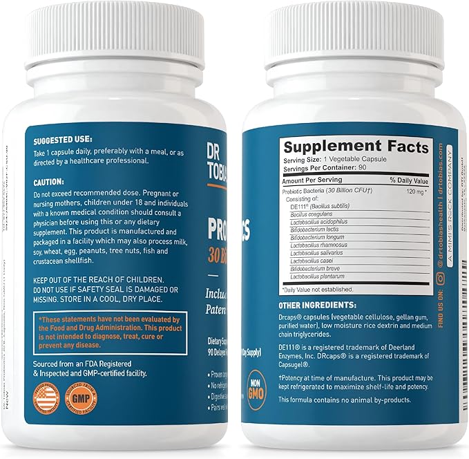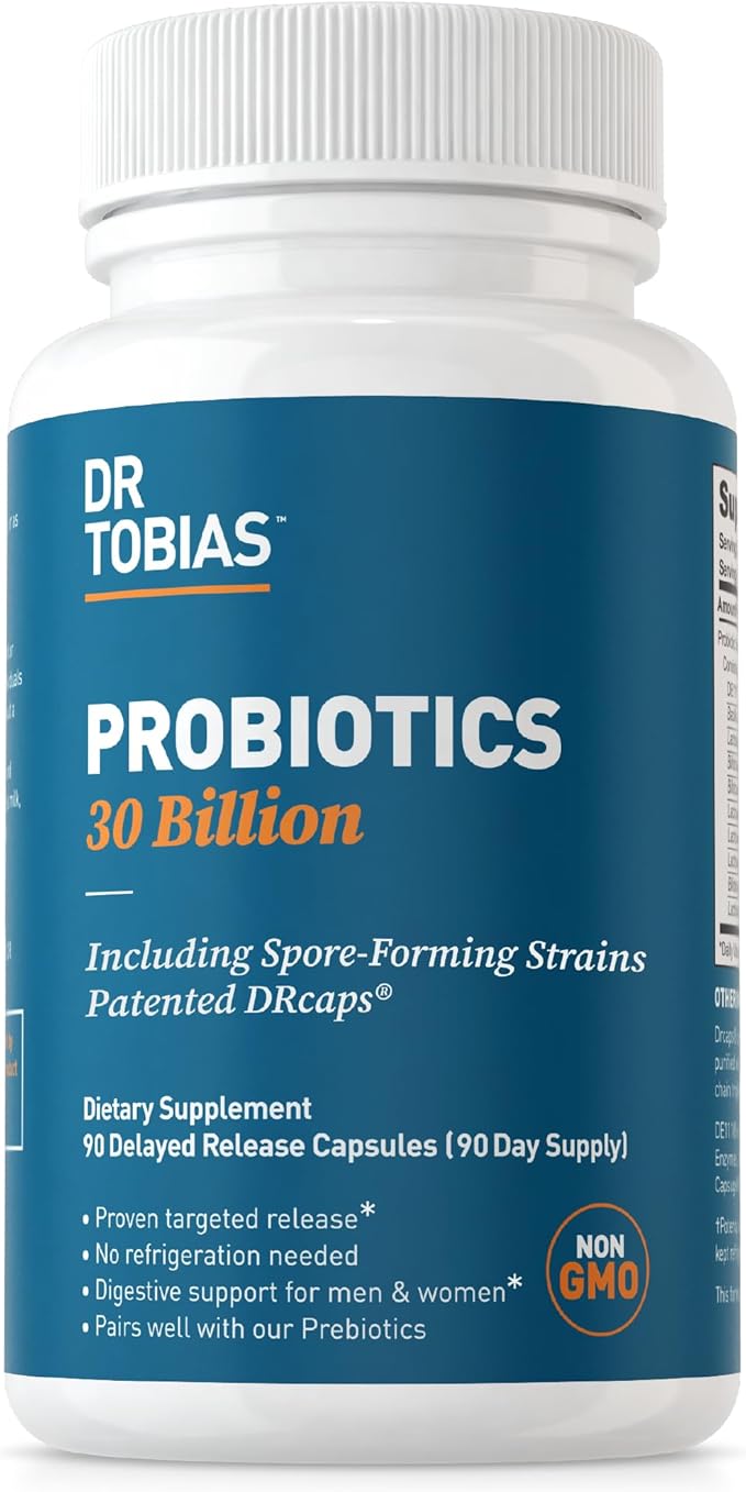 Dr. Tobias Probiotics 30 Billion, 10 Strains, 30 Billion CFU's, Targeted Release Probiotics for Women & Men, Supports Digestive Health, Shelf-Stable, Non-GMO, 90 Capsules, 90 Servings