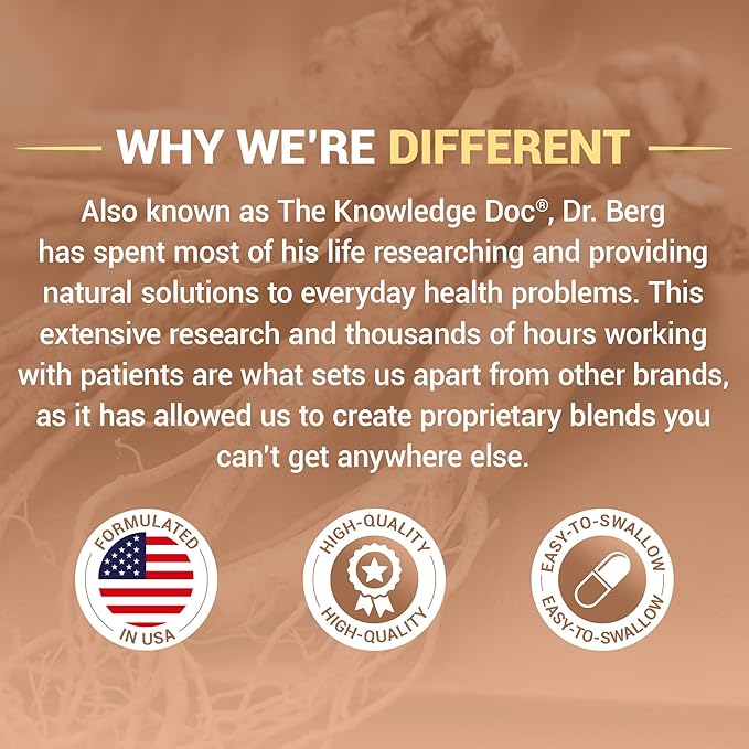 - 𝗪𝗛𝗬 𝗪𝗘’𝗥𝗘 𝗗𝗜𝗙𝗙𝗘𝗥𝗘𝗡𝗧 - Also known as The Knowledge Doc, Dr. Berg has spent most of his life researching and providing natural solutions to everyday health problems. This extensive research and thousands of hours working with patients are what sets us apart from other brands, as it has allowed us to create proprietary blends you can’t get anywhere else.