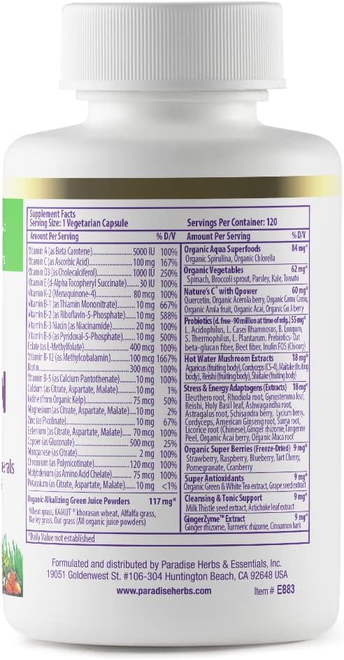 Paradise Herbs Earth's Blend Once Daily Multivitamin for Men, No Iron, 48 Organic Superfoods, Probiotics, Antioxidants, Vitamins A, B12, C, D, K2,120 Count