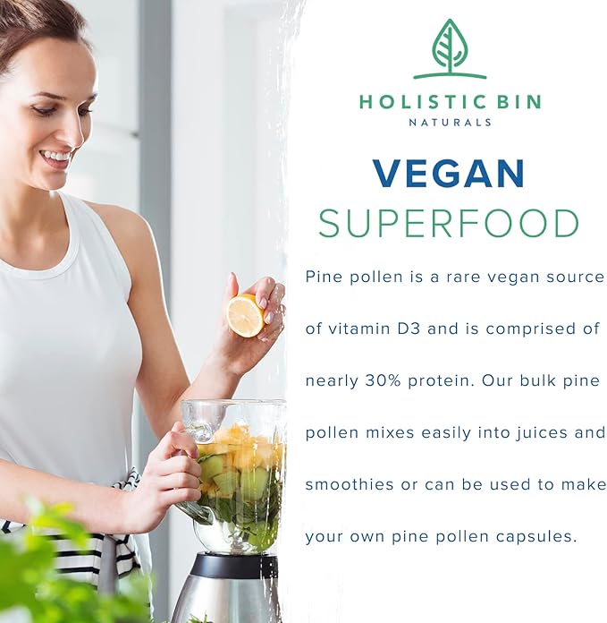 - VEGAN SUPERFOOD: Pine pollen is a rare vegan source of vitamin D3 and is comprised of nearly 30% protein. Our bulk pine pollen mixes easily into juices and smoothies or can be used to make your own pine pollen capsules.