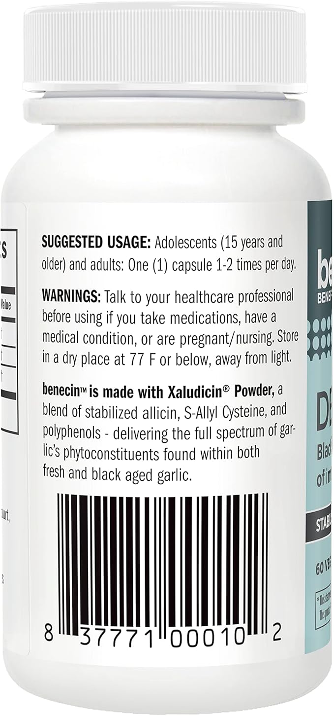 - 🧄 Plant-Based Garlic Formula Benecin features Xaludicin Powder with stabilized allicin, S-Allyl Cysteine, and polyphenols from fresh and aged black garlic.