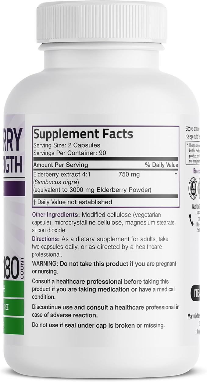 Bronson Elderberry Extra Strength, Supports Healthy Immune System & Antioxidant Protection, Non GMO, 180 Vegetarian Capsules